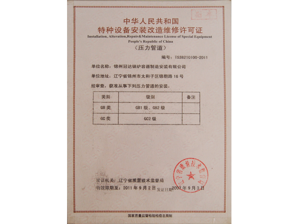 特種設備安裝改造維修許可證(壓力管道)